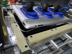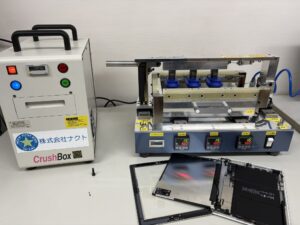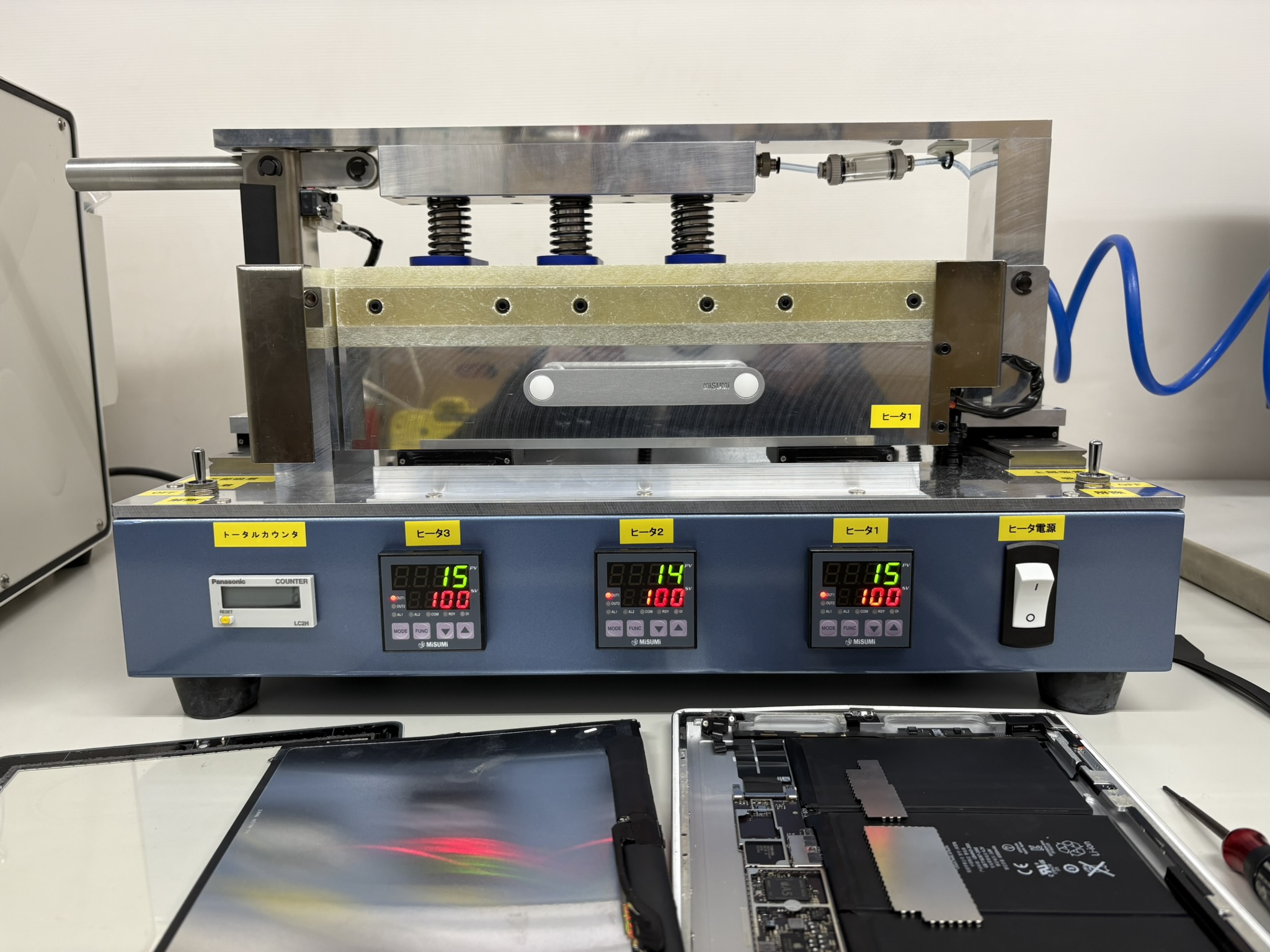 この装置は、使用されなくなった、Apple社製iPad、Microsoft Surface等のタブレット端末、iPhoneや各種スマートフォン等のタッチパネル部とその他外装部(バッテリー・各種制御基板装着部)の接着接合部分3辺へ間接的に高熱を当てることで接着力を低下させ、ターゲットの両面を真空吸着したところで上下に引き剥がします。